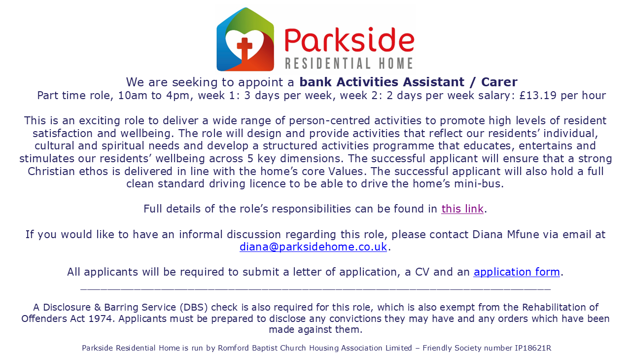 We are also seeking to appoint a bank Activities Assistant / Carer: